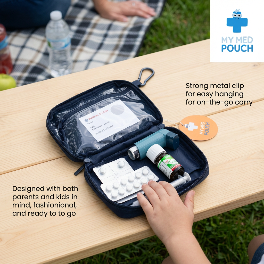 A compact, insulated carry bag designed to keep kids’ medications organised and easy to access — at home, out and about, or while travelling.