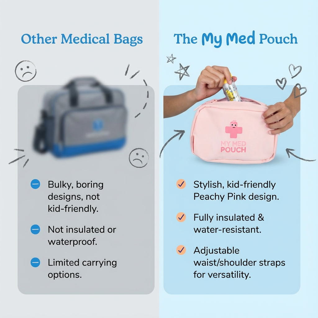 Some essentials - like EpiPens - are temperature-sensitive and need to be kept away from extreme heat, cold, and direct light. That’s exactly why My Med Pouch is fully insulated, helping support everyday storage when you’re on the go.